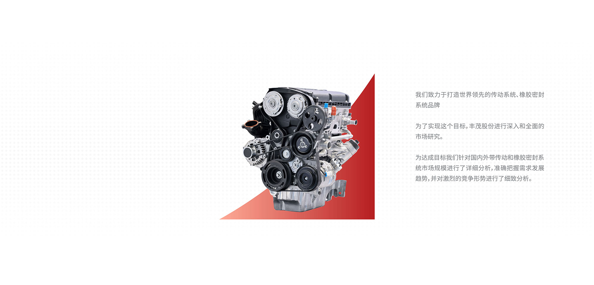 我们的产品主要包含四大系统架构:汽车皮带传动系统、、、、热管理系统、、、、空气悬架系统和密封系统